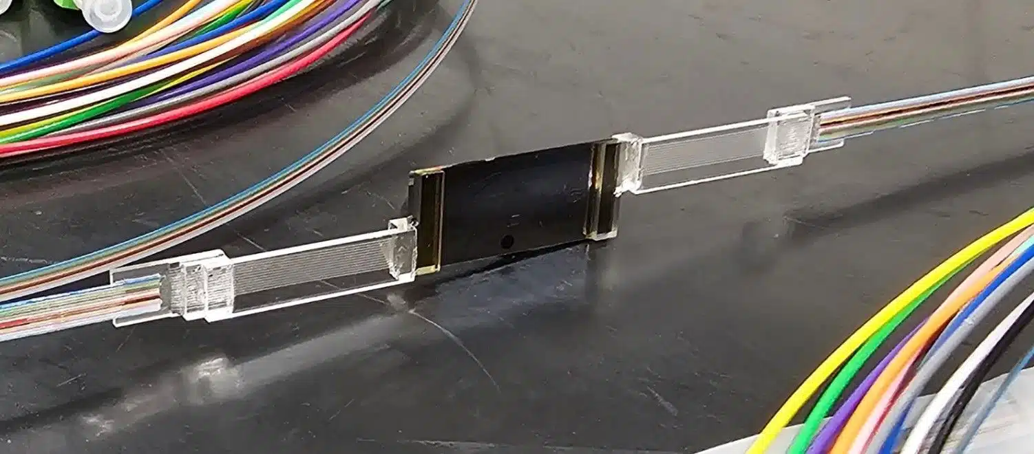 Whitin the Adoption project MicroAlign supplies, where possible, their Fiber Array units with near perfect pitch accuracy. Below a picture of a MicroAlign FAU and of a photonic module using MicroAlign FAUs packaged within the Adoption project.